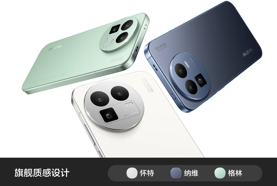影像方面,真我GT8与理光联名,搭载5000万像素主摄(支持OIS防抖)+5000万像素潜望长焦(3.5倍光学变焦,最高120倍)+800万超广角+1600万前置镜头,内置理光色彩滤镜。续航方面配备7000mAh双电芯电池,支持120W有线与50W无线充电。此外,手机还支持IP69/68/66防尘抗水、Wi-Fi 7、超声波屏下指纹、NFC与红外遥控。